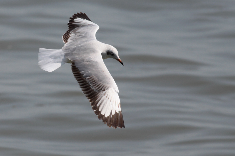 Beskrivelse: Brunhovedet Måge i 1. vinterdragt. Arten fælder - i hvertfald i dele af udbredelsesområdet - mere avanceret til 1. vinter end andre mågearter, og kan således allerede efterår/vinter fælde de juvenile dækfjer til adulte af grå type. Desuden fælder mange halen - enten dele af den eller hele halen, og de bliver da hvidhalede som man ser på denne fugl.