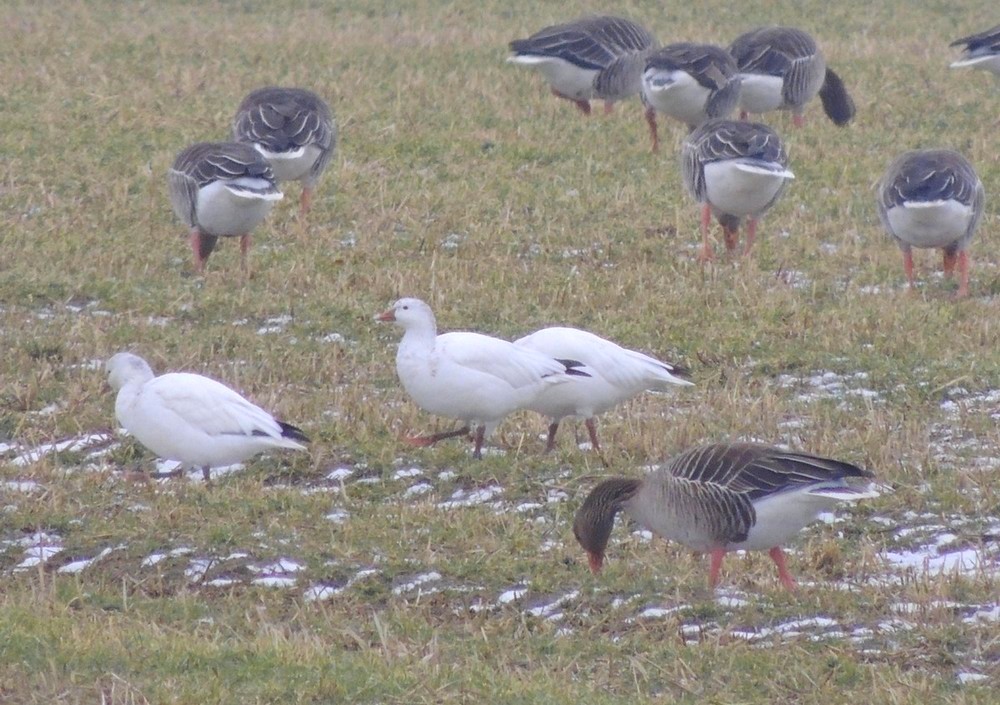 Vi stoppede ved en tilfældig gåseflok efter at have forladt motorvejen. Jeg kiggede ud og meldte tre hvide fugle. De gik med hovederne nede og da de var meget små i forhold til Grågæssene, var min første tanke, at det var hvide tamænder. <a target='_blank' href=' http://www.netfugl.dk/profiles.php?id=showprofile&profile_id=1900'>PAC</a> så først hovedet på dem og sagde derefter ”Ross Geese”. Det blev fuglene lidt mere spændende af og PAC fik lige spurgt til artens status i DK. Jeg tog nogle hurtige billeder og vi hoppede ud af bilen for at se dem i teleskop. I teleskopet afsløredes det hurtigt, at de alle var mærket med blå farveringe. <a target='_blank' href=' http://www.netfugl.dk/profiles.php?id=showprofile&profile_id=4512'>Julien Mazenauer</a> mente at kunne erindre, at 3 undslupne Ross Geese var set på Texel, så det var nok ikke værd at sætte sin lid til, at der var et blåringsprojekt af denne art i US. Fuglene lettede hurtigt efter, at vi kom ud af bilen. De blev set fra Marsk Stigs Vej. De var ikke så "blånæbbede" som arten kan være, men der kunne ses en blålig toning på den inderste del af næbbet.
