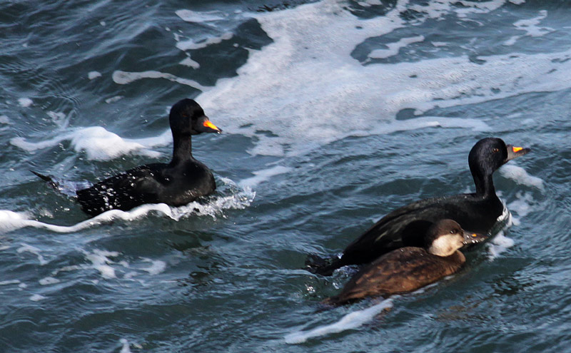 Dette, samt Sortandrikkernes individuelle variation med hensyn til næbtegning var der rigelig mulighed for at studere i den friske østenvind, da fuglene søgte tættere på land end normalt. Den mest almindelige tegning er en orangegul klat midt på næbbet, som det ses på hannen til højre. Set fra siden er den smal og svag. Hannen til venstre har en anderledes tegning med mere udbredt orangegult, der til og med bliver varmere rødtonet mod næbbasis. Sådan én liggende mellem fugle med den almindelige tegning kan godt få pulsen i vejret, da næbbet set forfra godt kan lyse reelt op, og man kan fejltolke fuglen som "Amerikansk Sortand". Bemærk dog feltens aflange form, da det ikke er "kittet ned i siden" som hos Amerikansk Sortand, ligesom den mindre knop fortsat er sort. Det er dog vigtigt at se fuglen fra siden for at være helt sikker på næbbet.