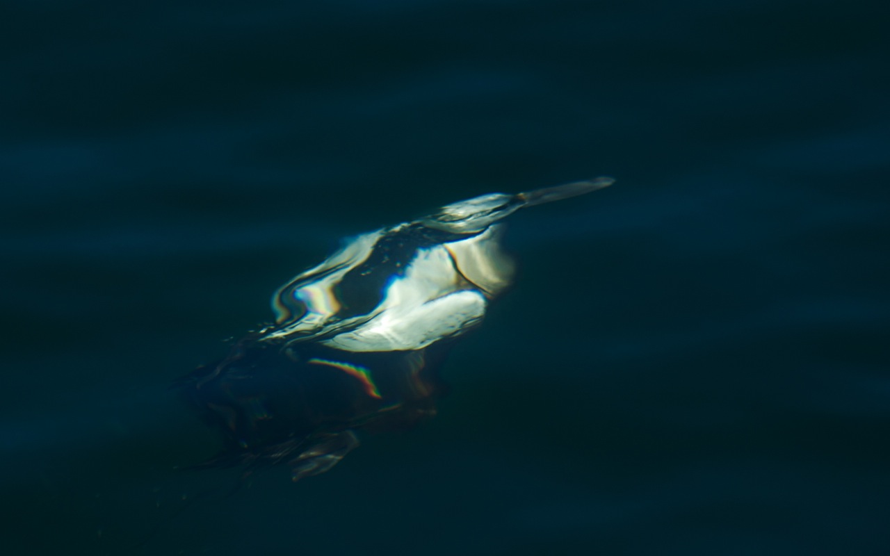 7 vingeslag til bunden. Så klappede den vingerne sammen og holdt sig nede med fødderne alene. En lille strøm af luftbobler gav en fornemmelse af fuglens position ... og pludseligt skød den op som en prop.