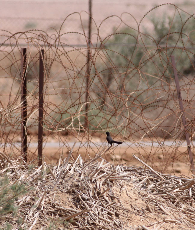 Beskrivelse: Årets art i Eilat: Sort Trænattergal. Denne fugl holdt til ved grænsehegnet mod Jordan (derfor pigtråden!), og i skrivende stund er det totale antal oppe på ca. 13 fugle. De, der planlægger et besøg kan passende checke rensningsanlægget ved Yotvata, hvor 2-3 fugle skulle holde til.