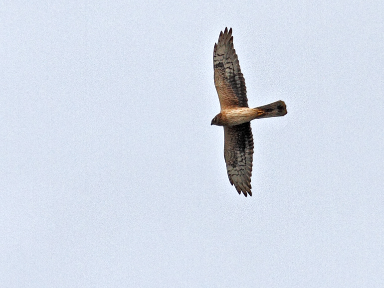 Første indtryk - slank kærhøg med lidt stive vinger. Ingen sort bagkant på hånden og meget lidt hvidt på overgumpen. Det tyder jo på steppehøg. Men hånden så lang ud, så der var en del snak om hedehøg...men det er vel en steppehøg 2K hun.