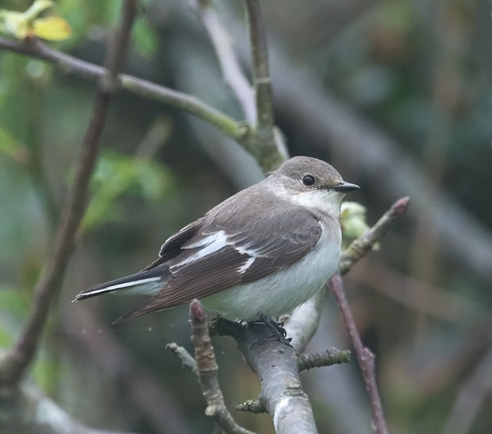 Beskrivelse: Fundet og bestemt af Peter Lyngs til en 2K hun pga. dens mere nussede og ikke helt så klare farver. Hun Broget Fluesnappers dragt kan variere ganske meget fra mørkt brunlig til ganske lys beige, hvor Hvidhalset Fluesnapper hun har en noget anderledes, gråkold farvetone med lys, musegrålig nakke og grålys overgump. Bestemmes især på den artsspecifikke, hvide ”dråbe”, eller tydelige, hvide lille streg vinklet ned på vingepanelet. Fuglen kan virke lidt mere tung og sat i det under fourageringen. Dråben på vingepanelet anedes også på afstand i flugten som en mere sammenhængende, vinklet hvid tegning på vingen.