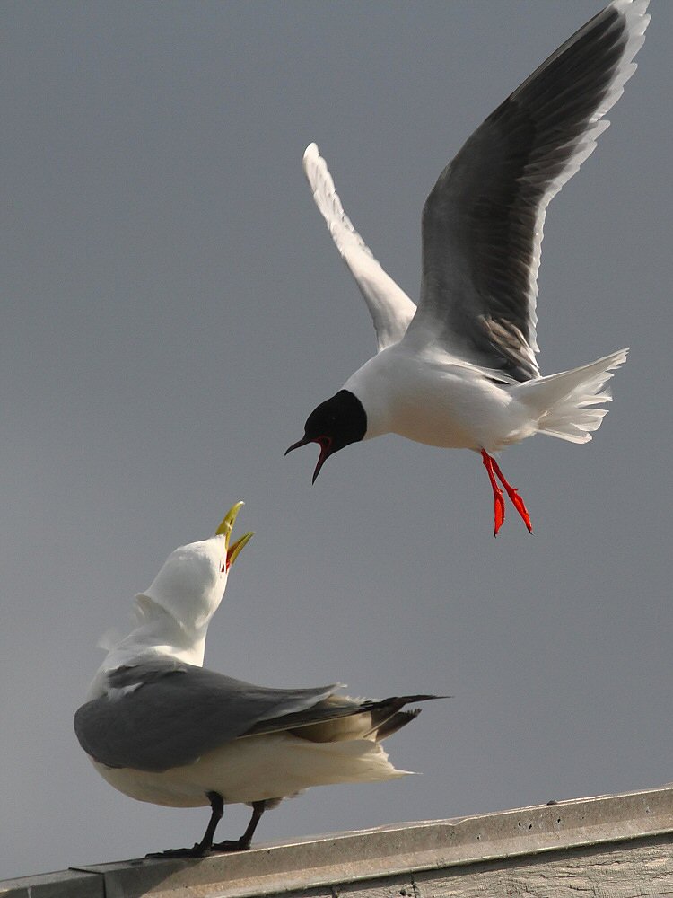 Beskrivelse: Riderne i kolonien på Pier 2 i Hirshals havn blev intensivt angrebet af dværgmågen. Først var det ynglende fugle og senere de som sad på taget. Det hele varede ca. 3 minutter. Med 400m linsen var jeg desværre lidt for tæt på.