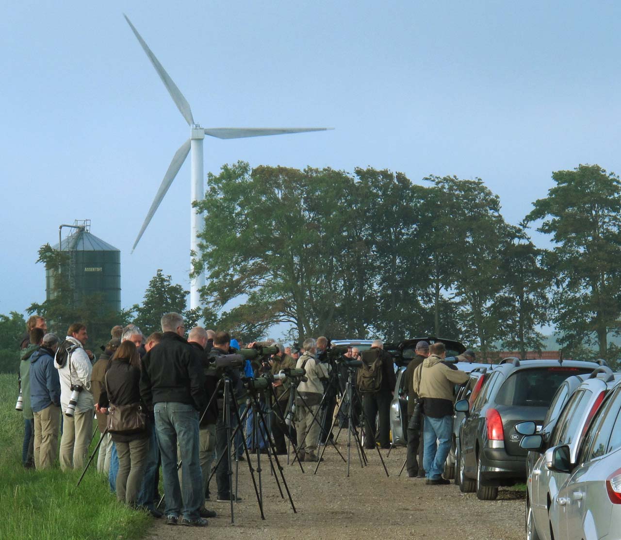 Beskrivelse: op mod 100 fuglekiggere ser på gåsegrib, der har overnattet i toppen af et udgået træ. Først kl. 10. lettede den