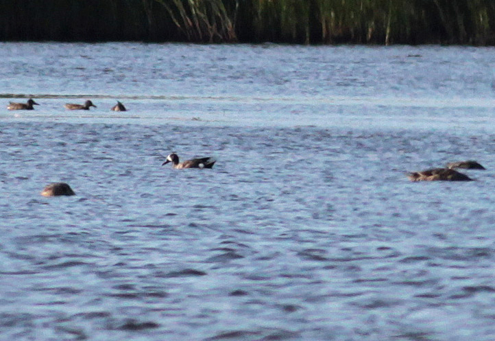 Beskrivelse: Den Blåvingede And holdt i morges til lidt længere nordpå end igår, men kunne ses fra Lyngagervej (der fortsætter iud gennem sumpen) udfor Staunings Ø. På dette fjernfoto ser man den karakter, der - når fuglen fouragerer eller sover - er mest iøjnefaldende: den lyse plet ved gumpen imod den rødbrune flanke. Netop den lyse plet var ofte det, vi opdagede fuglen på. Bemærk også, at blåvinget And ikke er nogen helt lille and, faktisk i størrelse mellem Gråand (til højre) og Krikand (i baggrunden).