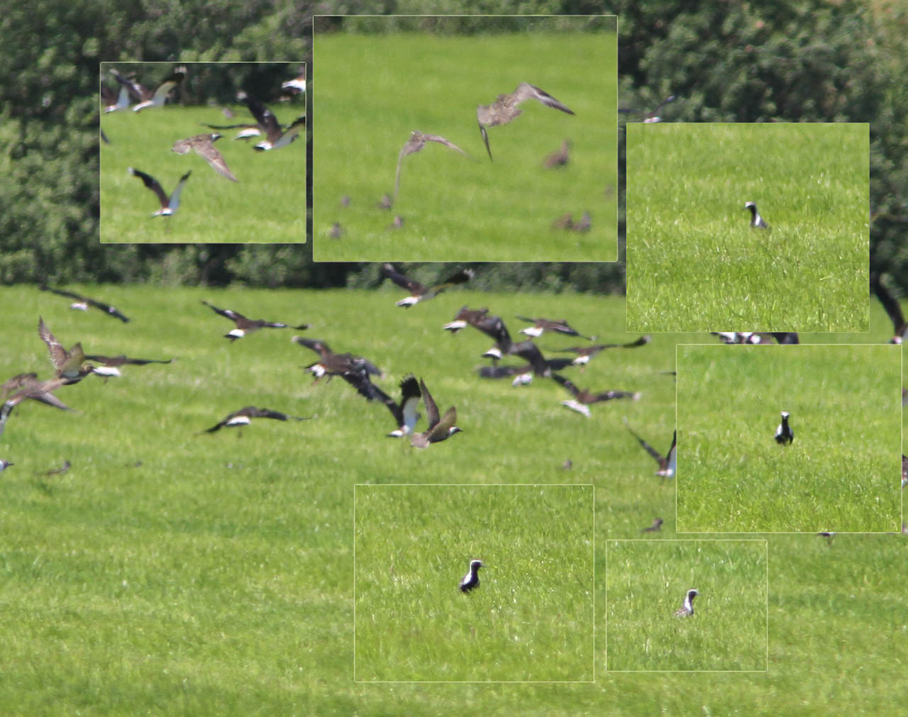 Beskrivelse: Bemærk undervingefarve sammenlignet med flyvende Hjejle til venstre. Tåspidsen stak desuden lidt ud i flugten, hvilket også ses. Fuglen hørtes desuden.