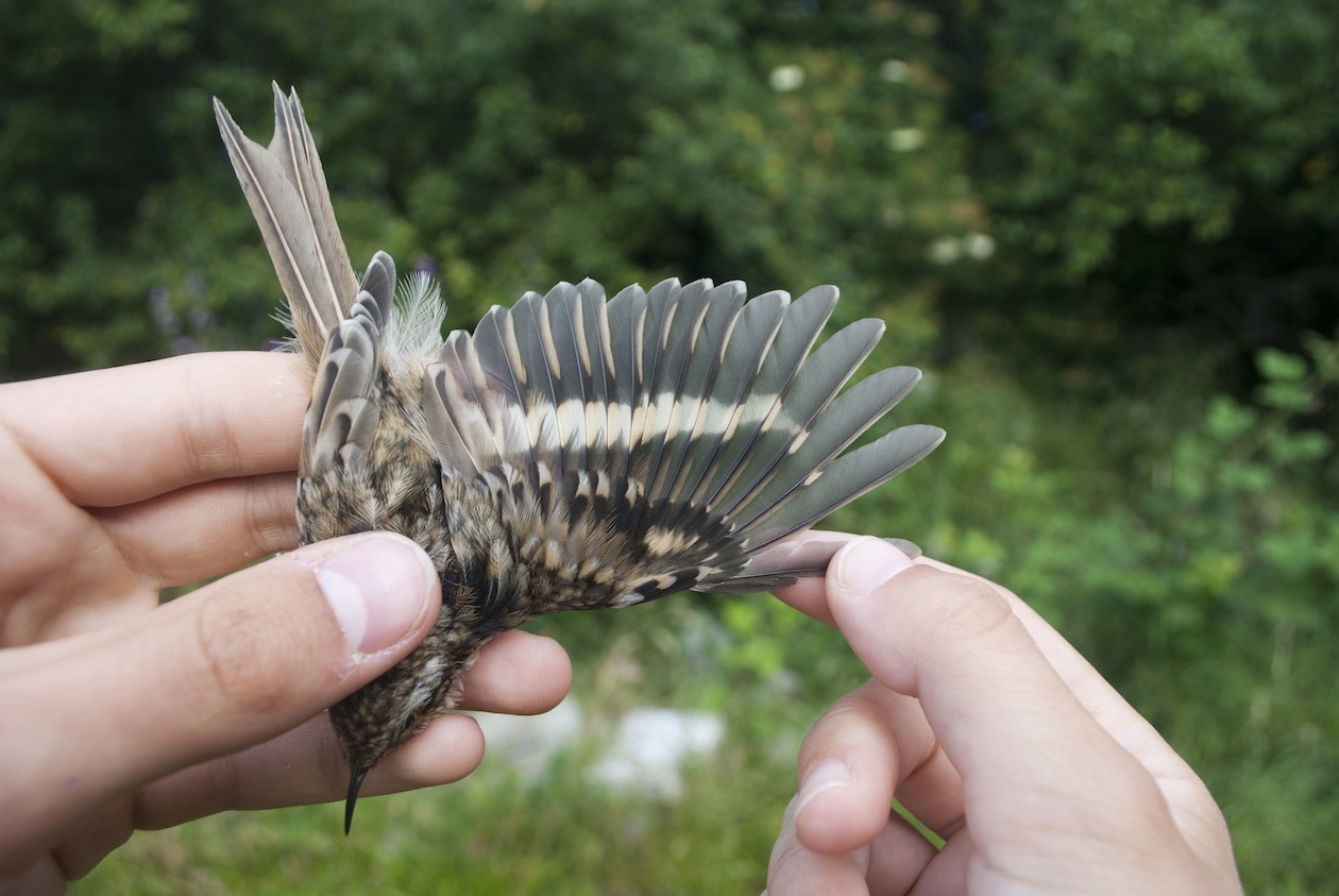 Beskrivelse: Bemærk tydelig lys plet på P4 og lyse skafter på halefjerene - to karakterer som er karakteristiske for Træløber.