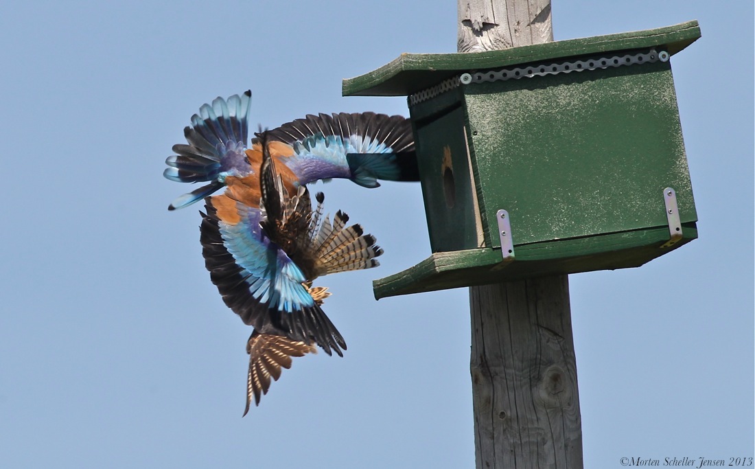 Jeg tror det var omvendt altså Lille Tårnfalk redekasse da Tårnfalkene ankommer noget tidligere end Ellekragerne og jeg ved at i Trujillo havde Tårnfalkene allerede unger i taget af tyrefægterarenaen. Jeg tror også at Falkene vandt slaget da hunnen og hannen i de følgende dage sad på kassen. Det var da ikke noget problem da der var masser af kasser at vælge imellem. Se også Lille Tårnfalke billeder fra tidligere i år, der er der et billede af kasserne.