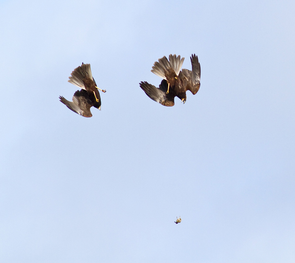 Beskrivelse: Hannen kommer flyvende og kalder. De 2 unger går på vingerne, og da han er lige over slipper han byttet.