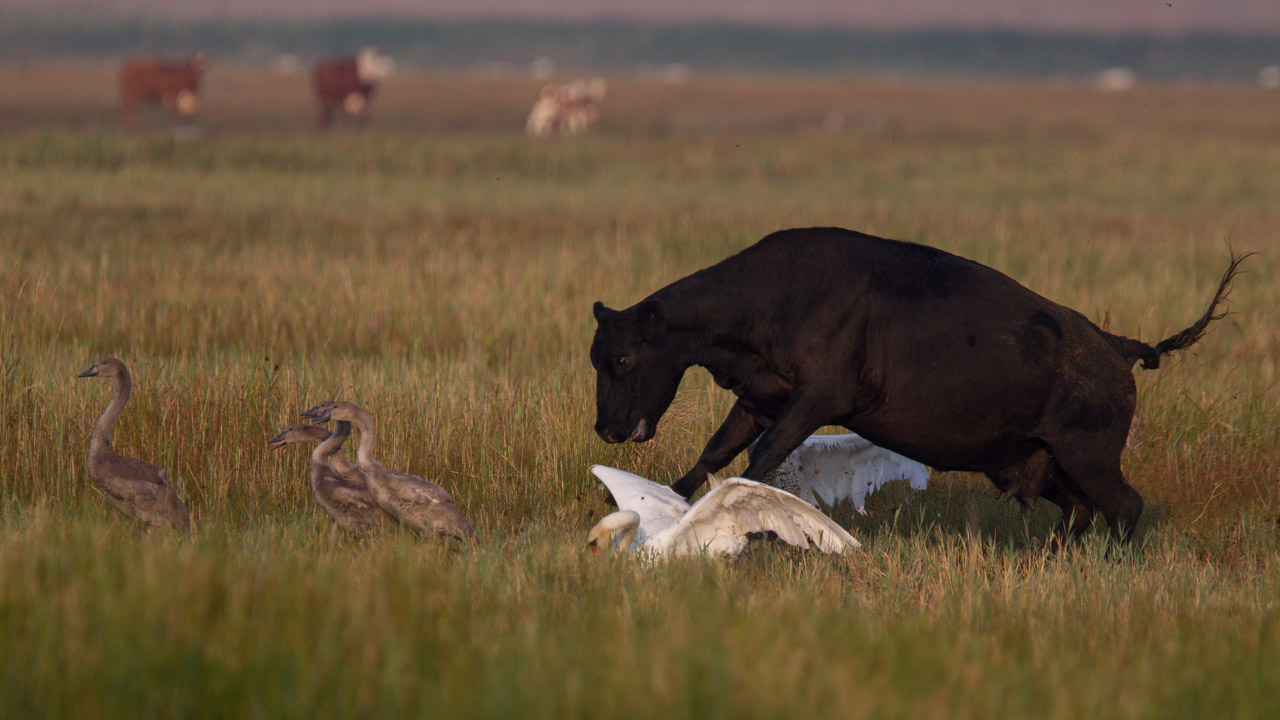 Beskrivelse: Et par Knopsvaner med fire unger kom vraltene over engen samtidigt med at en flok køer nærmede sig. Da køerne kom tæt på, gik Svaneparret i forsvars position, og pustede sig op, for at forsvare ungerne - det viste sig at blive skæbnesvangert !