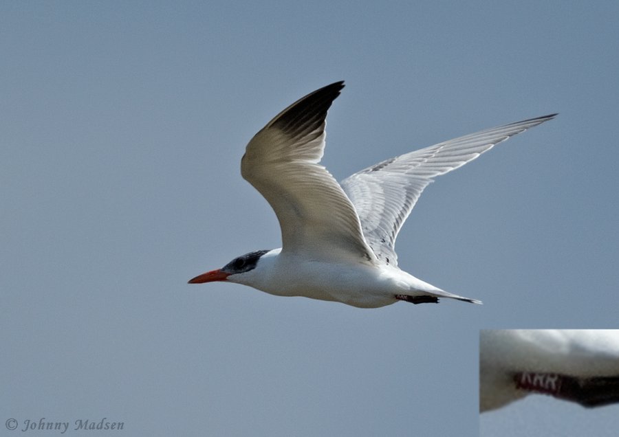 Skräntärnan (Sterna Caspia) är ringmärkt av mig, Ulrik Lötberg, på Långa Hållet utanför Oxelösund syd om Stockholm den 11/6 2013. Koden på ringen är KRR. Jag skulle uppskatta/bli glad om ni kan rapportera in denna tärna till Svenska ringmärkningscentralen på följande länk: