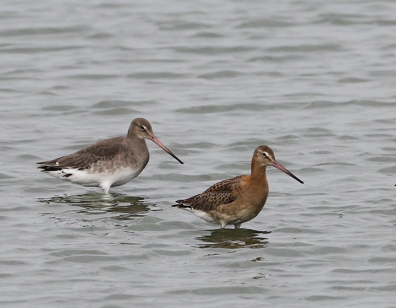 Beskrivelse: Størrelsesforholdet mellem t.v. Stor Kobbersneppe, adult i vinterdragt og t.h. Islandsk Stor Kobbersneppe, 1k.