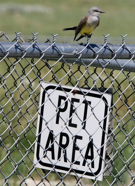 Beskrivelse: The secret wish of spending the rest of the life in a cage? - The kingbird stayed close to the pet area on an interstate 80 picnic ground.