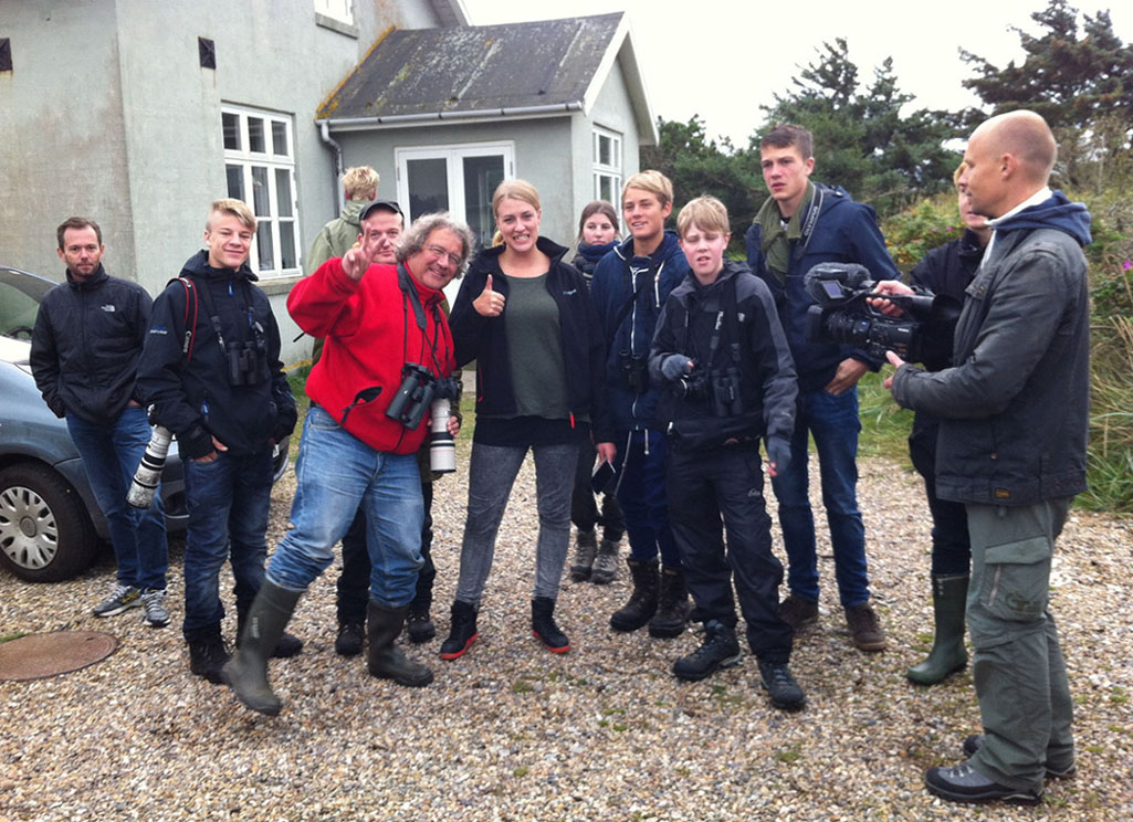 Beskrivelse: Klaus Malling Olsen med en flok forventningsfulde deltagere i DOF ungdoms efterårslejr med formand Vicky Knudsen i spidsen afventer fremvisningen af den lille kronjuvel Fuglekongesanger