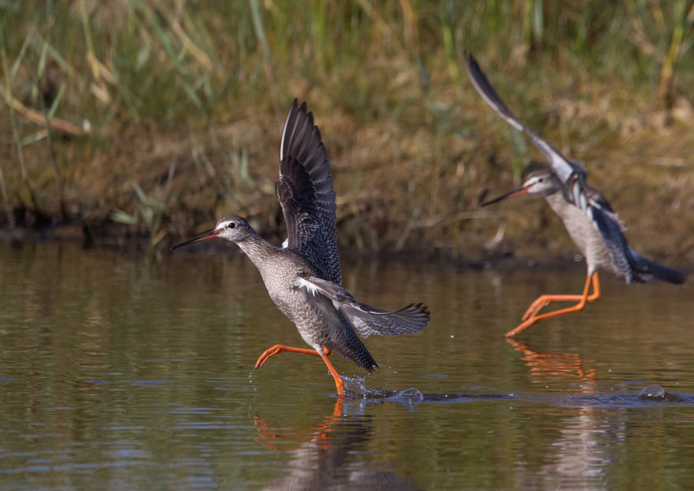 Beskrivelse: Et pludseligt angreb fra en artsfælle fik denne Sortklire til at danse hastigt over vandoverfladen - et spøjst syn...