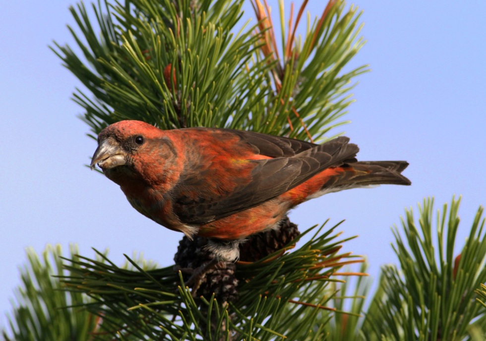 Beskrivelse: Det er ikke længere kun de store korsnæb, der er håndtamme ved Parkeringspladsen. I dag sås en blandet flok store og små korsnæb, hvor de små åbenbart har lært af storebror ikke at frygte mennesker.