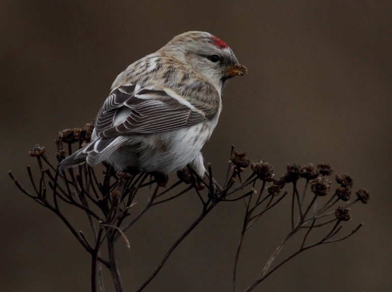 Beskrivelse: På vej ud mod den østlige mole for at finde bjergpiber, flyver 3 småfugle hurtigt op - den ene med tydelig hvid overgump - de fortsætter langt ud over havet, men vender tilbage til urterne på stranden. Ad flere omgange får jeg en masse gode billeder ad fuglen.