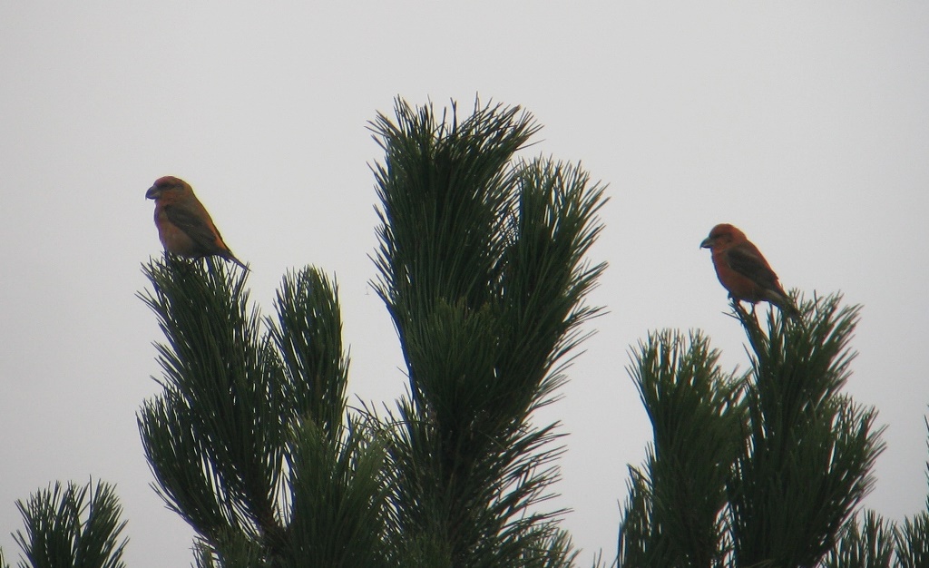 I går var jeg heldig at få et billede af to røde fugle sammen, hvor man kan man se forskellene i størrelse og proportioner, næbbets højde og vinkel i forhold til pande, overnæbbets krumning og undernæbbets tykkelse samt stor korsnæbs "tyrenakke" og mattere farve. Især synes jeg, at hovedformen er slående på billedet og måske det mest brugbare på afstand.