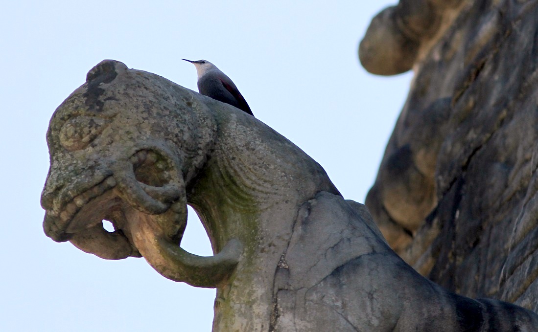 Gracil, tryg fugl på toppen af solid, tempelvogtende Kimære.