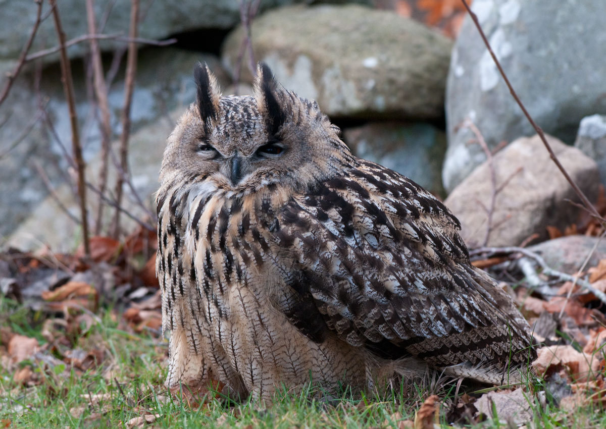 Hej Peter. Denna hösten har flera Berguvar hållit till runt Varberg. Flera sedda mitt inne i stan och till synes orädda.Denna individen sitter faktiskt vid ett bostadsområde och hittades av dom som bor där. Oss fotografer brydde den sig inte mycket om, bara när några Kråkor blev närgångna reagerade den lite mer.