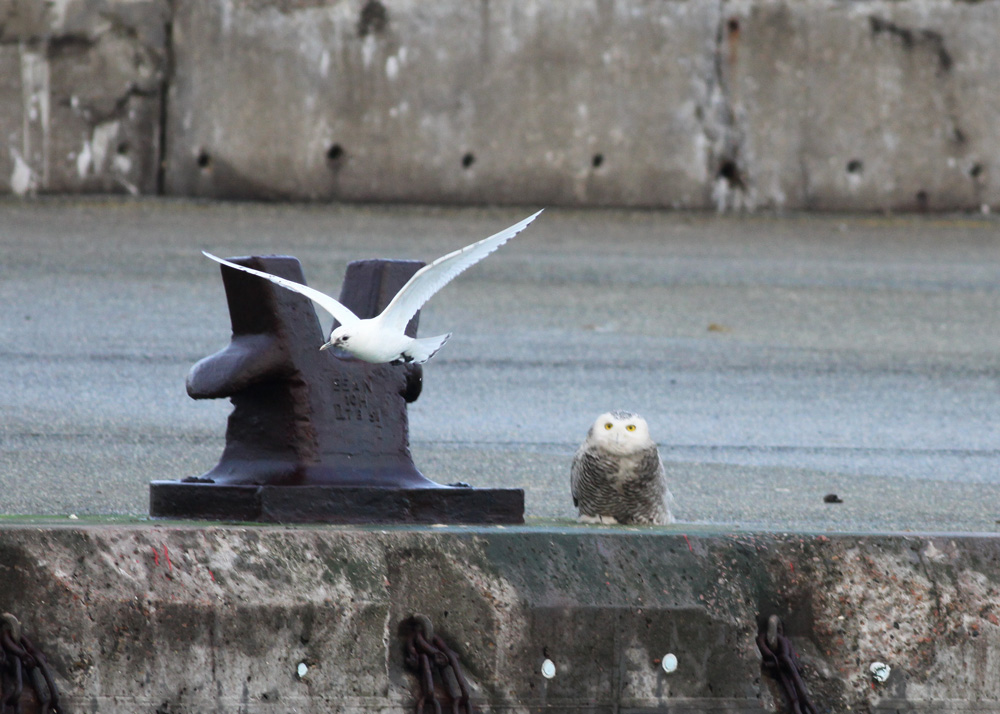 Jo tak, Rune! Det var i sandhed et drømmescenarium, der udspillede sig den eftermiddagstime igår med uglen siddende på modsatte kaj, mens Ismåge, Hvidvinget Måge og Gråmåge fløj rundt over havnebassinet foran! Der var vist iøvrigt ingen af de op mod 75 tilstedeværnede fuglekiggere, inkl. undertegnede, der havde set uglen ankomme. Den sad der bare lige pludseligt!