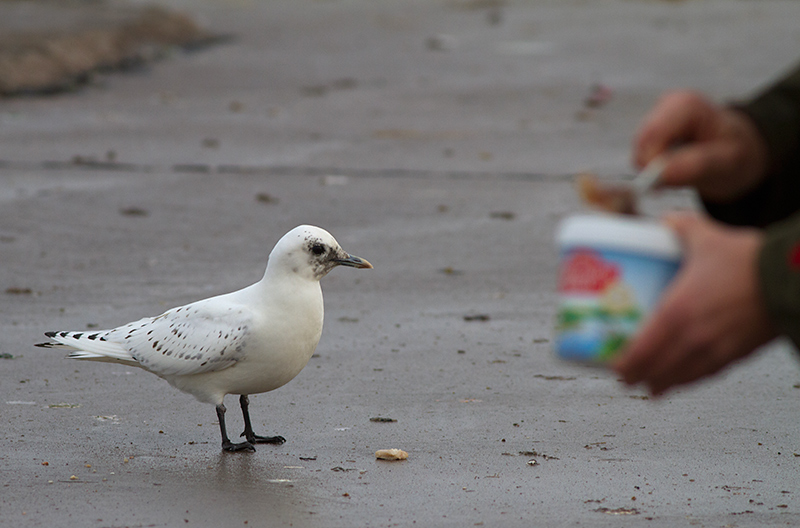 Jeg er slet ikke sikker på, at fodring af Ismågen skæmmer forekomsten - mågen var trods alt flere dage i havnen inden den blev fodret første gang og selv på dage med fodring, har den fourageret "naturligt" på døde måger i havnen.