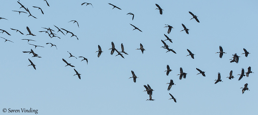 Beskrivelse: Vi så flere gange store flokke med African Openbill langs Chobe/Linyanti flodsystemet både i Botswana og i Namibia. Flokken her var på ca 150 fugle, så billedet viser kun et udsnit.