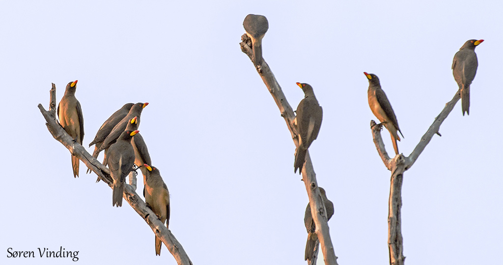 Beskrivelse: På vej ud af parken løb vi på dette træ med 13 Gulnæbbet Oksehakkere (den sidste er beskåret væk af æstetiske grunde). Jeg har aldrig set så mange Gulnæbbet Oksehakkere på én gang.
