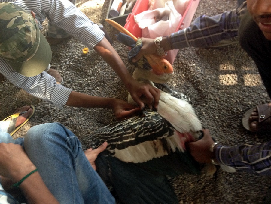 Beskrivelse: Bhavnagar a city of a million and a quarter residents, is home to a remarkable resident population of near threatened, Painted Storks right in the center of town. But a state wide kite festival, where illegal glass covered string (for cutting the string of other kites)is used results in thousands of birds losing their lives every year. This january in Bhavnagar alone 20 of these Painted storks died! The bird in the picture was lucky having only superficial wounds. Young volunteers collect and treat the birds. This year they held mock funerals of the storks, which drew national media attention and hopefully will give the birds greater protection next year.