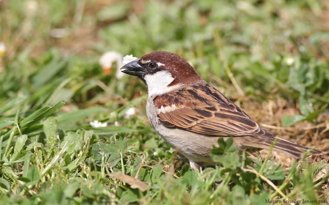 Beskrivelse: Italiensk Spurv ligner Gråspurven men har brun kalot og denne har ikke det sorte på brystet