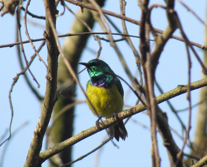 Beskrivelse: På dragten kan den godt forveksles med Variable Sunbird, men det relativt korte og tykke næb afslører, at det er en Collared Sunbird.