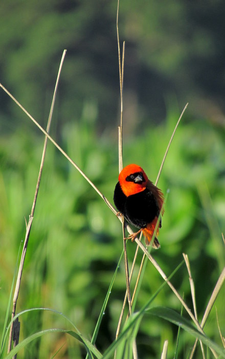Beskrivelse: Et fast indslag ved alle vådområder i det sydlige Afrika, hvor hanner i forskellige nuancer af orangerødt er meget iøjnefaldende i toppen af rørskoven.
