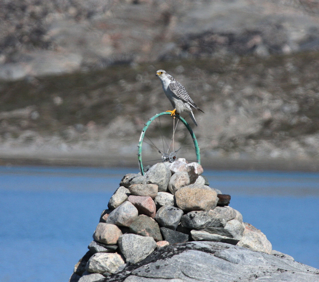 Titel: Grønlandsk hvid fase Jagtfalk på grønmalet cykelhjul på varde