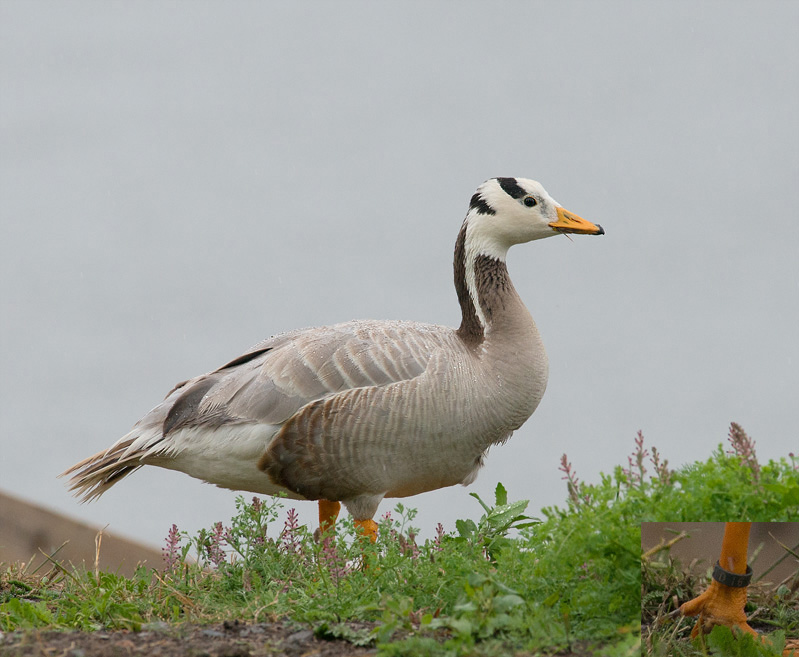 Beskrivelse: Fouragerede lidt overraskende mellem Grågæs på campingpladsen og havde en lille mørk ring om højre ben med Nr D 16 synligt på ringen.