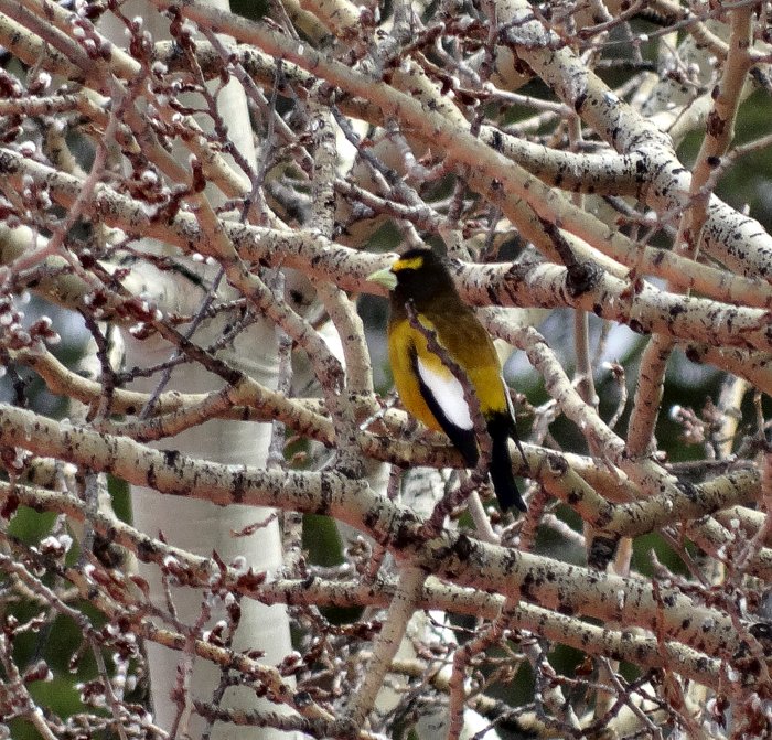 Beskrivelse: En forgæves eftersøgning af Rosy Finches ved en foderplads i Rocky Mountains var ikke helt spildt, da der var 20+ af de eventyrligt smukke Evening Grosbeaks på stedet.