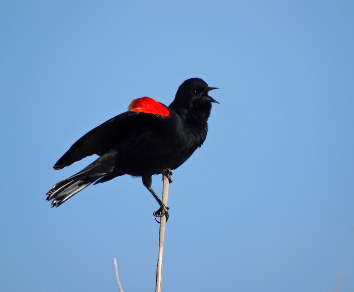 Beskrivelse: En meget almindelig fugl ved vådområder i Nordamerika, hvor den ikke bare gør sig bemærket med sin meget højlydte stemme, men hannerne 'flasher' også deres røde skuldre, for at gøre sig til overfor hunnerne.