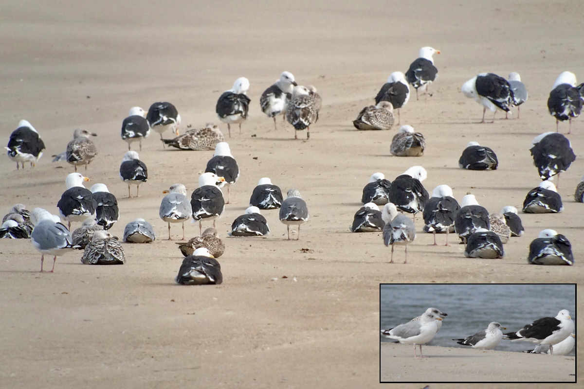 Beskrivelse: Adult <i>graellsii</i>-type with GBBG's and HG's. Also an <i>intermedius</i>-type LBBG can be seen for comparison a few metres to the left of the <i>graellsii</i>.