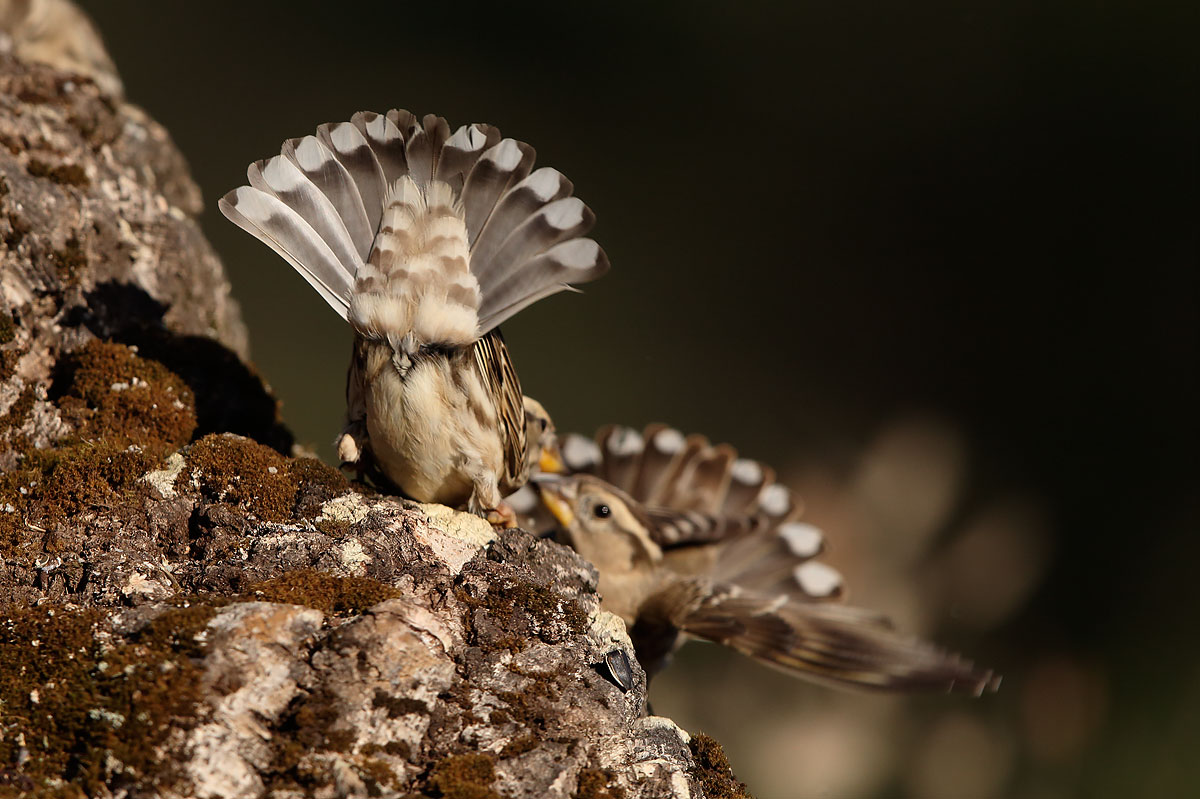 Beskrivelse: Stenspurvene var meget aggressive og udover at holde andre småfugle væk fra foderpladsen, sloges de en del indbyrdes. Som ses her, er Stenspurvens hale meget karakteristisk.