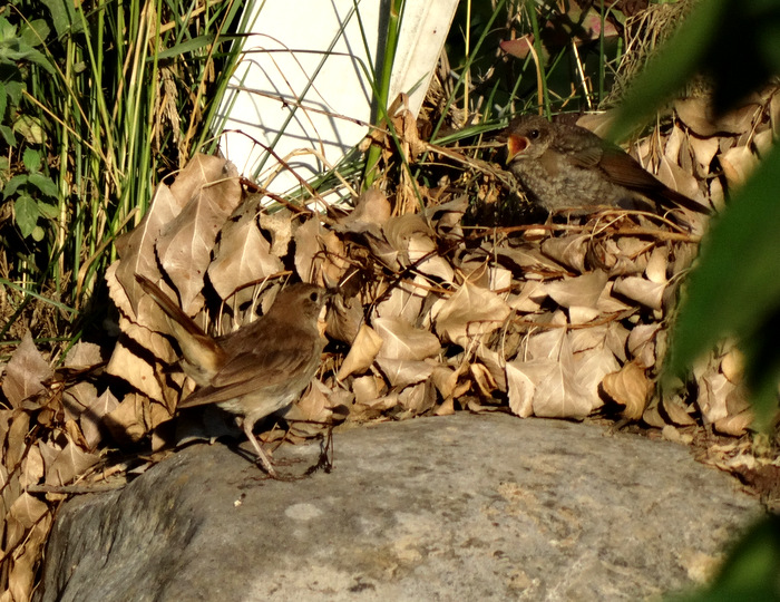 Beskrivelse: Midt i juli var det begrænset, hvor meget de Sydlige Nattergale sang, men lidt havelusk omkring vandløbet i landsbyen afslørede et par med nyudfløjne unger.