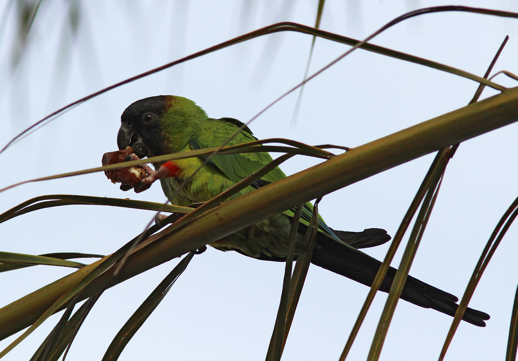Beskrivelse: Fuglen på billedet var i en flok på 14 Nandayparakit, en Senegalpapegøje og en Alexanderparakit. Flokken blev fundet i parken overfor Hotellet Andorra.