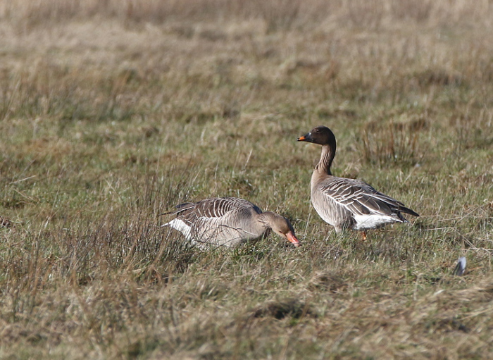Beskrivelse: 2 sædgæs fouragerede sammen med 8 grågæs.