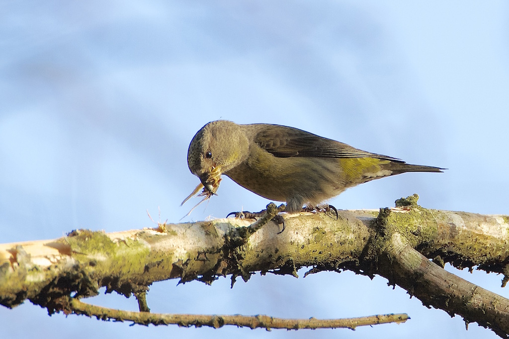 Beskrivelse: Et par Lille Korsnæb hentede redemateriale af flere omgange på den samme gren. Det var hunnen der lavede arbejdet, medens hannen bare fulgte med.