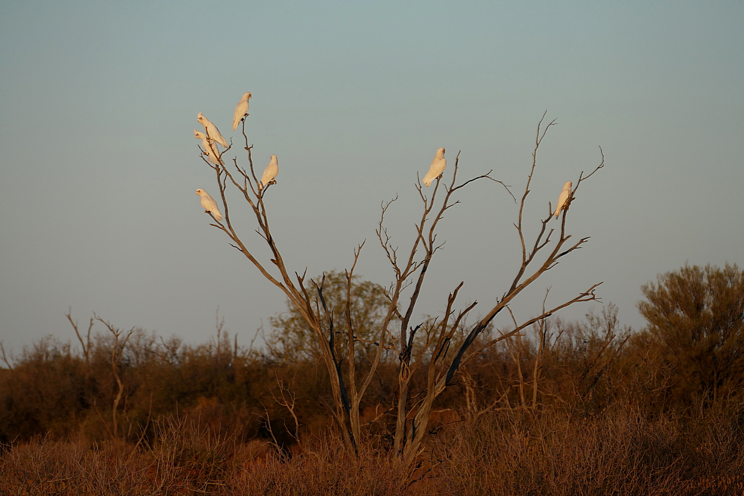 Beskrivelse: Meget stemningsfuldt med små flokke a Little Corella som kom flyvende ved solnedgang.