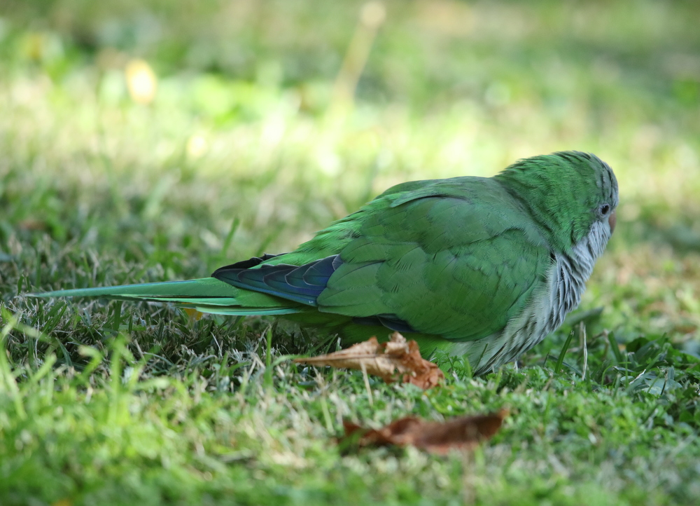 Endeligt en Munkeparakit inden for fotoafstand, og så flyver der en skide tamdue op og dækker lidt af vingen på Munken.