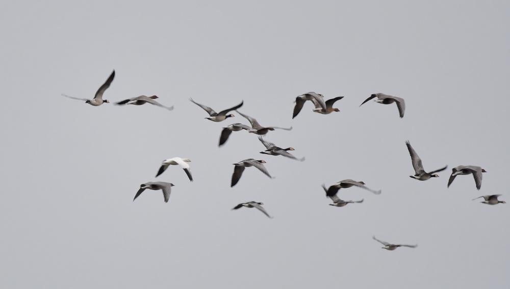 Fine gæs, jeg tror nu ikke, at det er rene dværgsnegæs. På den midterste gås, hvor næbbet ses, er det tydeligt at afgrænsningen til hovedet er kurvet, hvilket er karakteristisk for snegås eller hydrid sne/dværgsnegås. På en ren dværgsnegås skal afgrænsningen være en lodret lige linie, desuden bør næbbet som beskrevet have en mere tydelig blå-farvet næb basis.