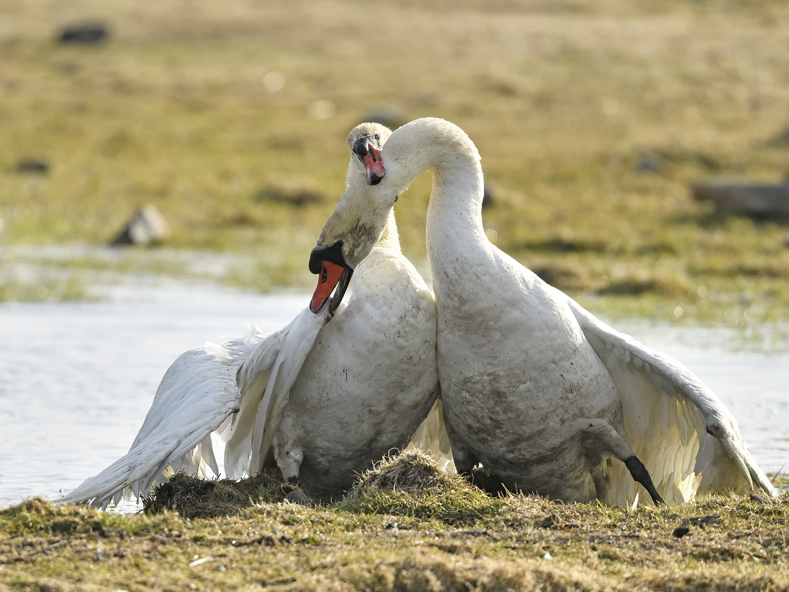 Beskrivelse: Et par Knopsvaner med fire unger kom vraltene over engen samtidigt med at en flok køer nærmede sig. Da køerne kom tæt på, gik Svaneparret i forsvars position, og pustede sig op, for at forsvare ungerne - det viste sig at blive skæbnesvangert !