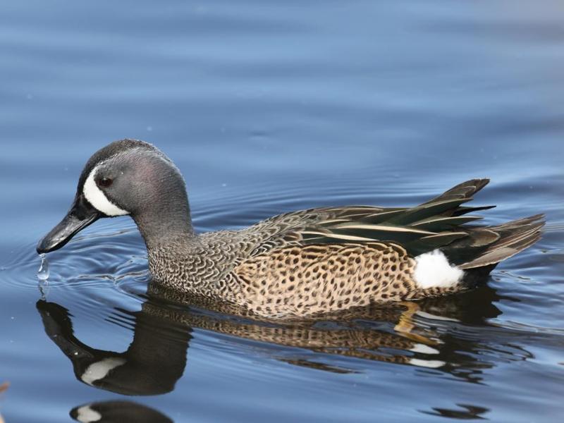 Beskrivelse: Den Blåvingede And holdt i morges til lidt længere nordpå end igår, men kunne ses fra Lyngagervej (der fortsætter iud gennem sumpen) udfor Staunings Ø. På dette fjernfoto ser man den karakter, der - når fuglen fouragerer eller sover - er mest iøjnefaldende: den lyse plet ved gumpen imod den rødbrune flanke. Netop den lyse plet var ofte det, vi opdagede fuglen på. Bemærk også, at blåvinget And ikke er nogen helt lille and, faktisk i størrelse mellem Gråand (til højre) og Krikand (i baggrunden).