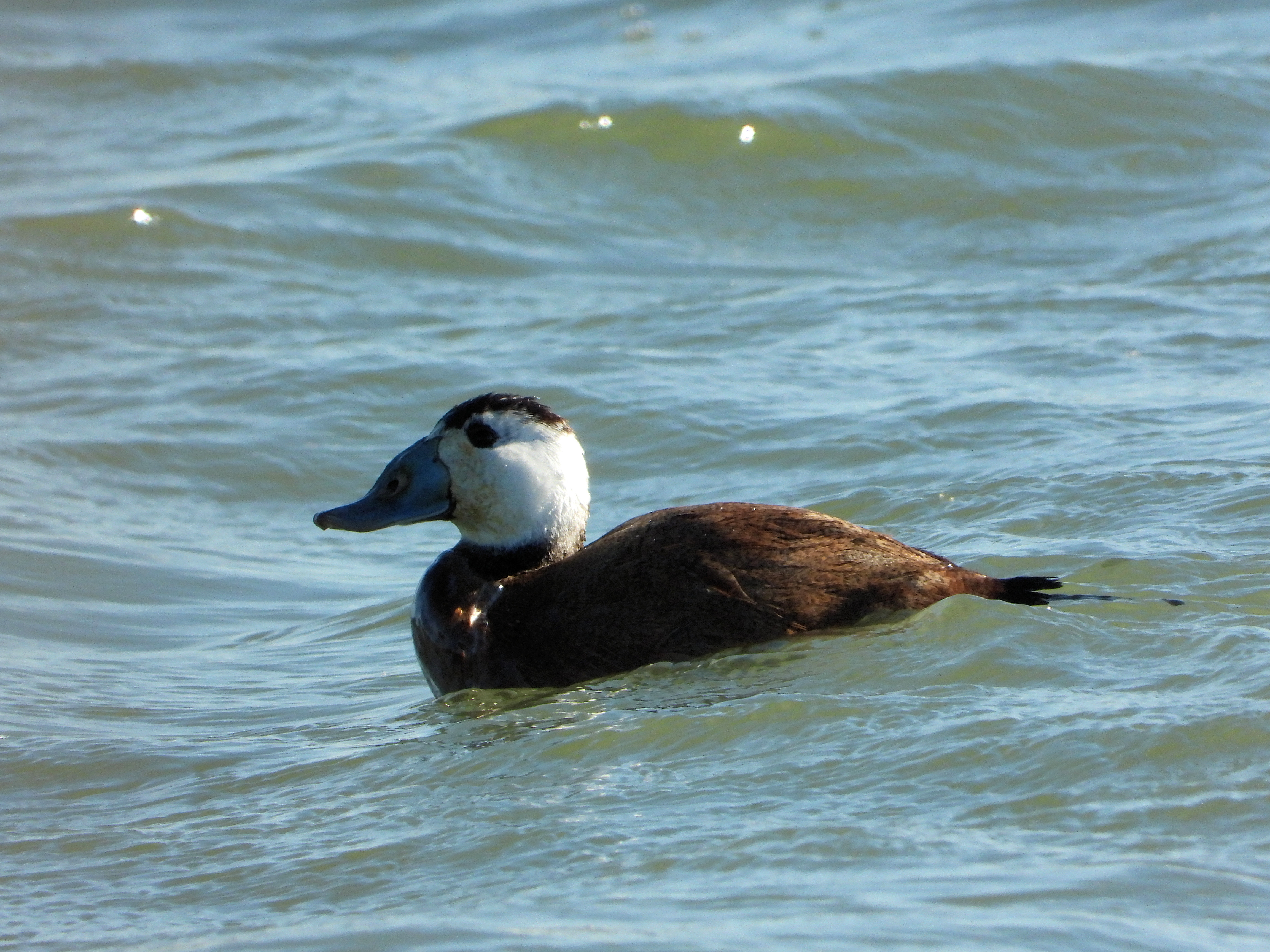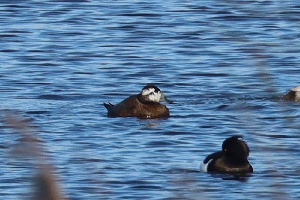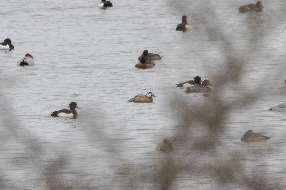 Beskrivelse: Hvidhovedet And - bemørk på denne fjerne fløk den særegne lysebrune grundfarve, der ofte afslører arten på afstand, hvid den da ikke har rejst halen på en måde, som har fårt nordmændene til at døbe skarveænderne "stivhale-ænder".