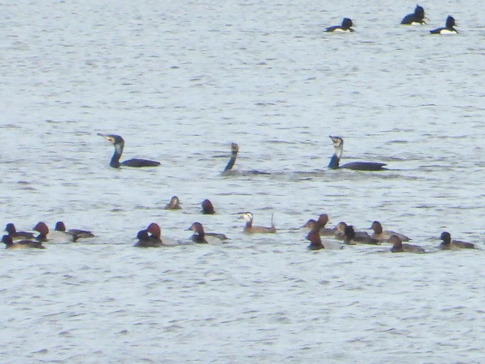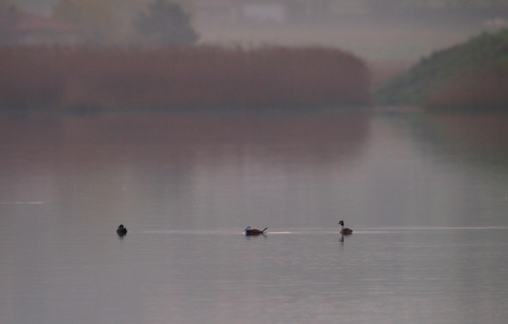 Beskrivelse: This rainy day there were at least 14 birds in the lake. Females and males in a loose group - the males 'fighting' to position them selves in the mating proces.